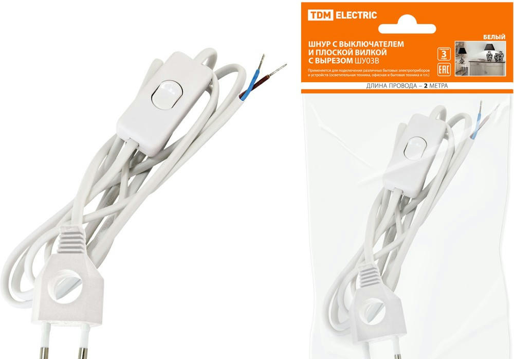 Шнур с выключателем и плоской вилкой с вырезом ШУ03В ШВВП 2х0,75мм2 2 м. белый TDM